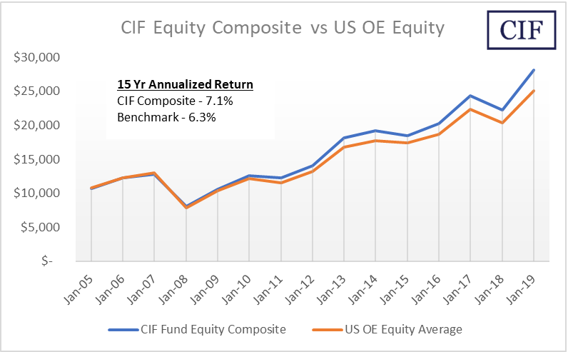 The CIF Equity Fund Composite average, with an annualized return of 7.1%, outperformed the similar Benchmark weighted average return, which had an annualized return of 6.3% over the 15-year period. There were 35 funds included in the Composite across 16 categories.